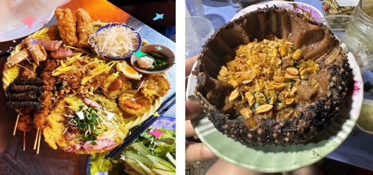 Bánh xèo tôm, bún cá, và đặc biệt là món nhum (cầu gai) tại đây có kích thước lớn gấp 2–3 lần bình thường.
