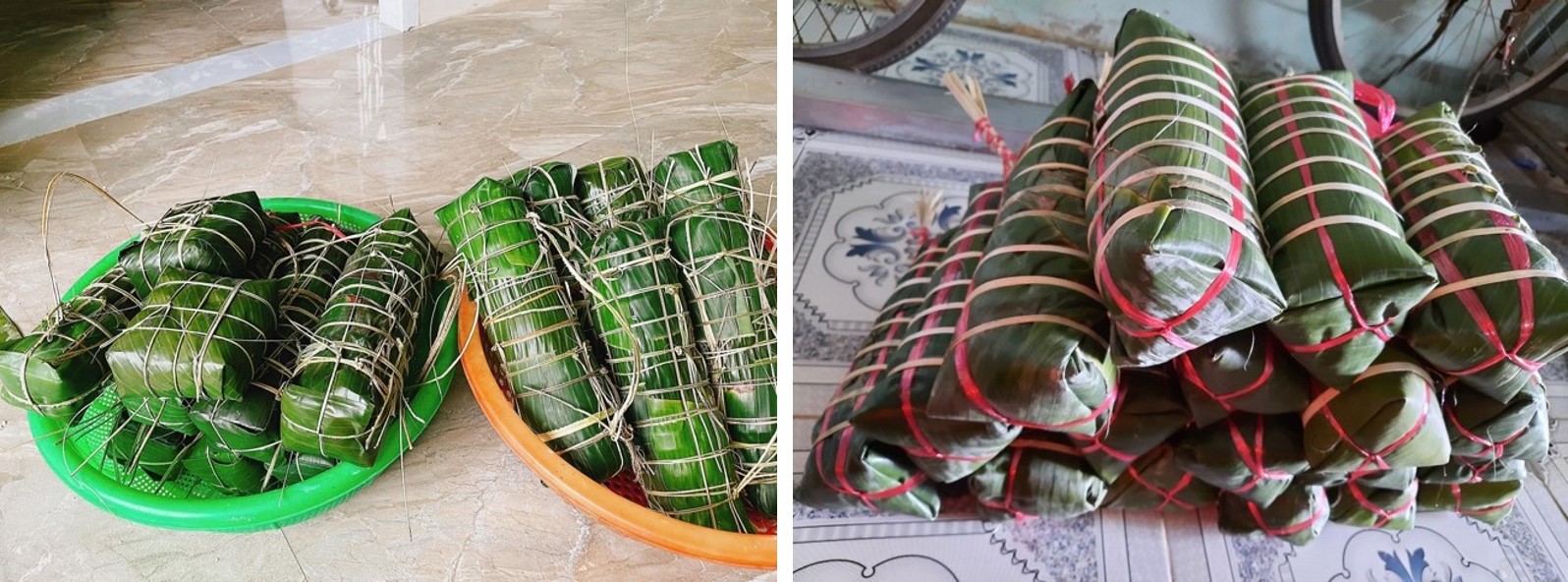 Bánh chưng và bánh tét do Thắng (bên trái), Ngân (bên phải) làm