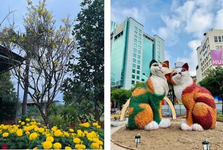 Trang trí tết nhà Bình (bên trái) / Đường hoa với linh vật “mèo” ở TP.HCM (bên phải)