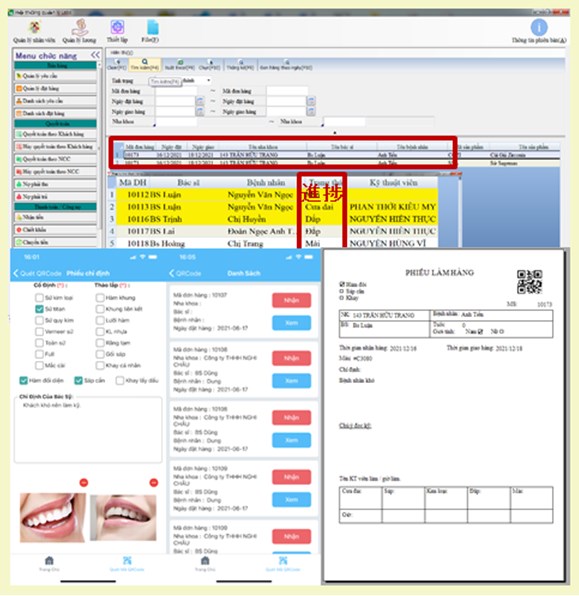 Xuất mẫu thông tin đơn hàng trên màn hình đăng ký đơn hàng. Kỹ thuật viên có thể quét mã QR để xem thông tin đơn hàng. Hệ thống nha khoa cho phép bạn biết tiến độ của đơn hàng.